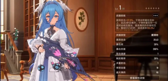 基础属性:震荡攻击20.63,攻击率20%,暴击伤害200%,触发几率20%,最大弹药90发。技能:震荡攻击伤害+37.5%,子弹命中目标附着,3秒后爆炸。多颗子弹黏着同一位置,伤害叠加+范围爆炸,黏弹越多破坏力越强,二次爆发威力大。