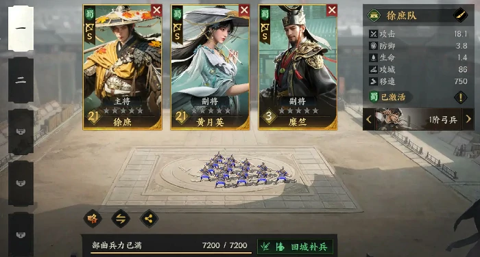 开荒组弓兵队核心输出,盾兵队承担伤害,两队同步培养。弓兵队选王平/徐庶(首抽)+黄月英/主线赠送角色;盾兵队用关兴、张苞。无理想武将,用法正过渡。打地前必须侦查,斥候探守军兵种强度,调阵容降战损提胜率。