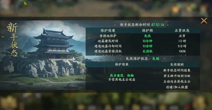 新手保护期内,城池建筑资源地免攻击。主动攻击、君主殿10级、退盟会提前结束保护。优先占满内城8块资源地,安全稳定。外城土地待主力成型后扩张。资源建筑升级策略:木工坊先升5级,再升石作坊。升级顺序:石作→木工→磨坊→民居。