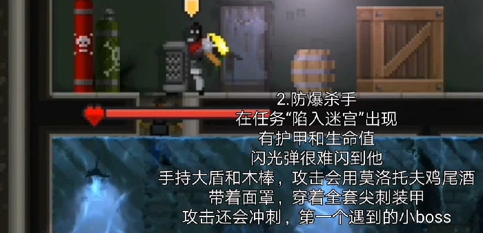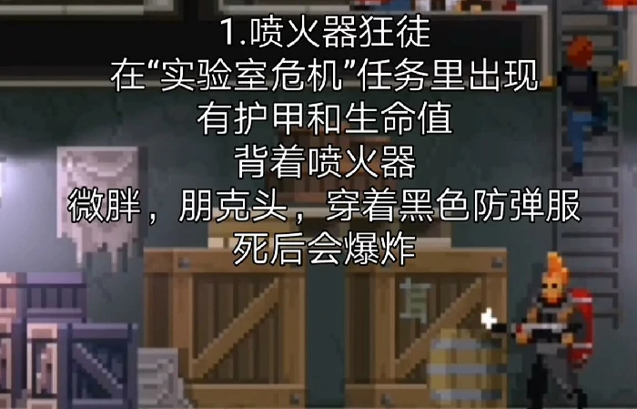 四大首领特点速览:实验室危机喷火器狂徒(双血条+自爆),迷宫任务防爆杀手(大盾+燃烧瓶),街头传闻装甲重兵(高防弹甲+沙鹰),冒险人生黑帮打手(喝酒回血+沙鹰刀具)