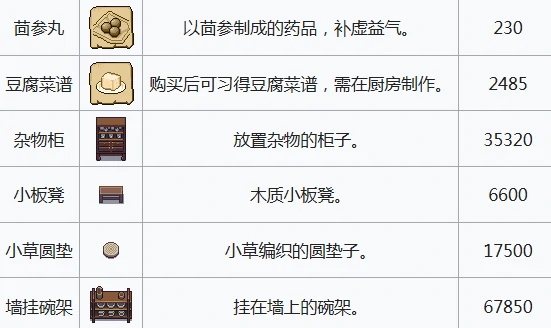 道具药品别错过:止血散(210钱)快速回血,茴参丸(230钱)补虚益气。杂物类入手杂物柜(35320钱)扩容背包,家具类添置木凳(6600钱)、草编圆垫(17500钱)、墙挂碗架(67850钱)装扮家园。