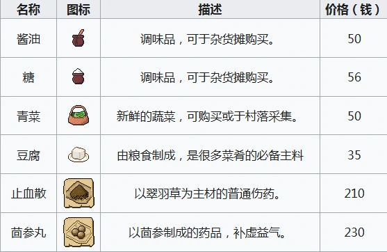 采购食材看这里:调味品买酱油(50钱)、糖(60钱);蔬菜选青菜(50钱,也可自采);基础材料囤豆腐(35钱)。想学菜谱?花2485钱购豆腐配方,厨房直接解锁新菜。