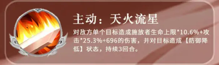 周瑜被动技能火歌弦刃在每回合行动结束后有30%概率为一名队友附加炎之盾,护盾可叠加,持续时间与必杀技相同。主动技能天火流星针对单体目标造成伤害,伤害计算包括生命上限的10%、攻击力的25%以及额外固定数值,附带降低目标防御的效果。