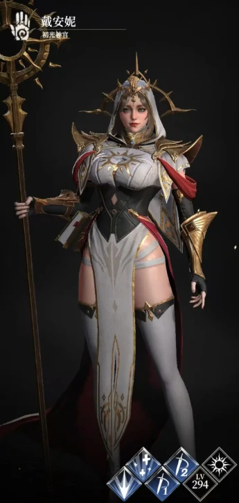 光奶戴安妮(初光神官):后期治疗辅助,前期治疗量有限,关卡推进敌人变强后治疗价值凸显,克单体boss,地下城挑战优,必穿回能套契合技能循环回复机制,优先配专属装备虹羽贝歌。