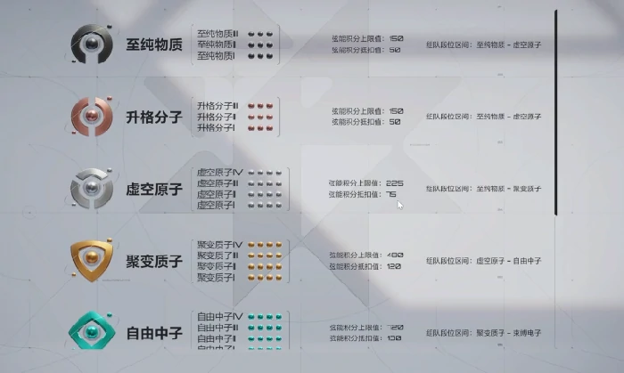 游戏段位共分9大阶。初始段位至纯物质,逐步晋升至升格分子、虚空原子,此为入门三阶段。低段位晋升需累计4场排位胜利,积攒星级积分。