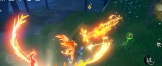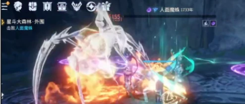 释放核心技能“凤翼天翔”,角色腾空,火焰环绕。针对地面目标,如人面魔蛛,升空形成压制,躲避攻击,扩大火焰技能范围,高效输出。