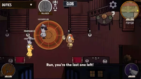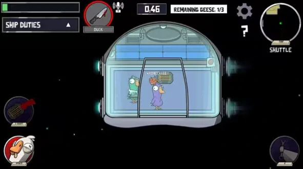鸭子自由活动时可刀人,刀后有冷却。发现尸体立即报警。任务进度全队共享,所有人完成任务即获胜,无视剩余鸭子。鸭子会关门、断电干扰任务,趁机刀人。做任务结伴行动,互相照应。警惕假装做任务的鸭子,他们不贡献进度。