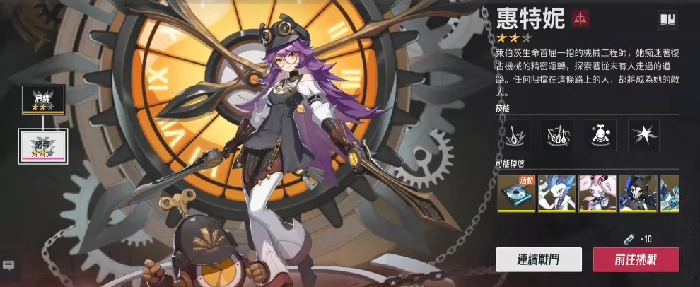 惠特妮只有一条生命值,但会召唤4个发条小怪随从。这些小怪伤害高,且惠特妮行动后有20%概率发起追击,所以队伍整体练度很关键。阵容配置上,推荐以谛听为核心,搭配一名光系或暗系主C角色,保证输出能力。