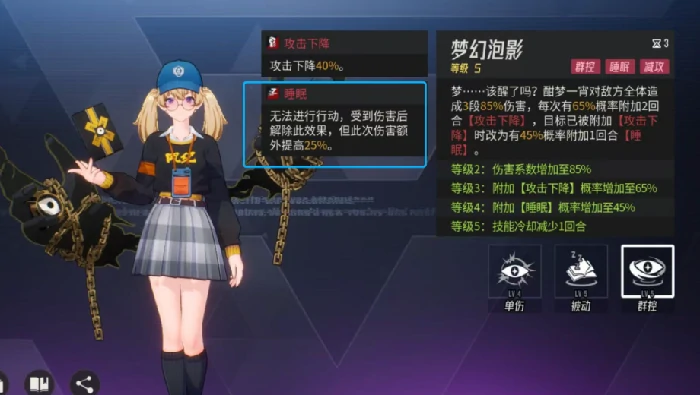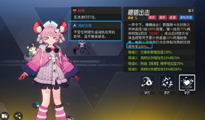 敌人睡眠时受25%额外伤害,糖糖大招击杀单位后,溅射继续影响其他敌人。搭配拉条角色提升出手频率,渺渺、马哥、幻影千明都是好选择。渺渺治疗加冰封控制,配合糖糖压制。