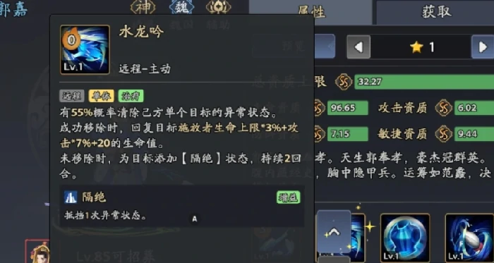 郭嘉技能"水龙吟"效果:单体伤害+55%概率清除异常+治疗;被动技能:15%概率清除自身异常,战斗时长延长可增强效果。阵容构建注意:避免功能重叠,保持战术多样性。