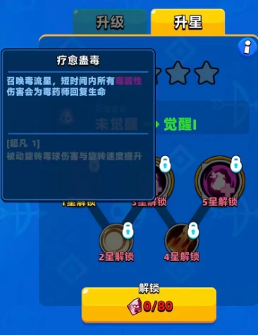一星解锁疗愈蛊毒,召唤毒流星,毒属性伤害按比例回血,中毒频率高回血强,被动提升旋转毒球伤害与转速。二星获久经战阵,提升攻击与生命属性。
