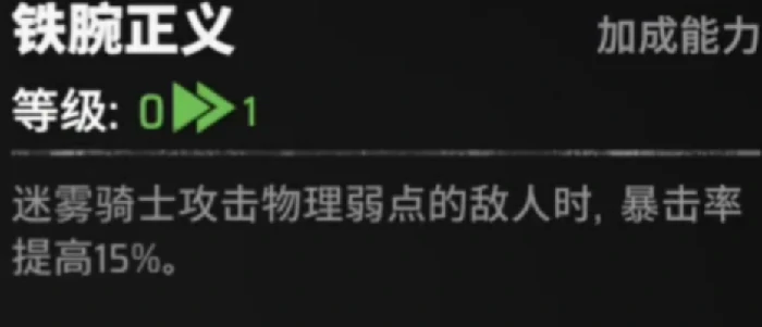 被动技能强化:“锁定装填”让强化普攻必暴击;“铁腕正义”永久加15%攻击力;“驾驭狂热”击杀敌人后获15%攻击增益,持续10秒。三被动叠加,奠定高暴击、高物伤战斗风格。