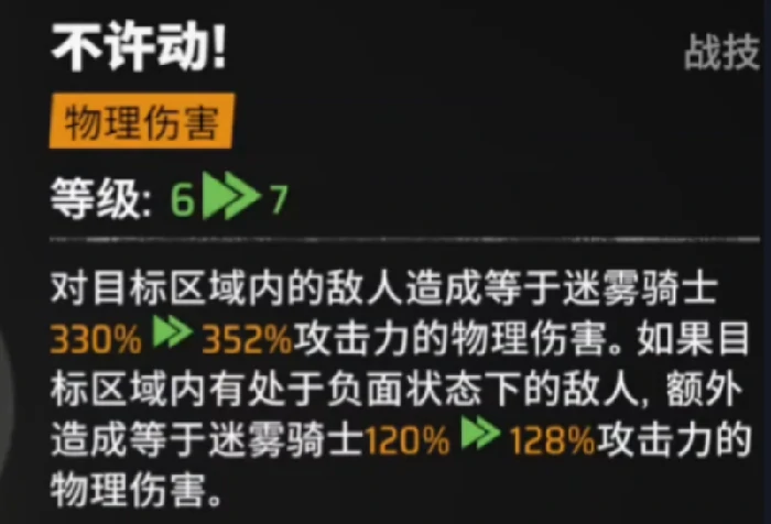 范围技能“不许动”:基础轰出330%攻击力物理伤害。区域内敌人带负面状态时,追加120%攻击力伤害,务必搭配减益队友放大杀伤。
