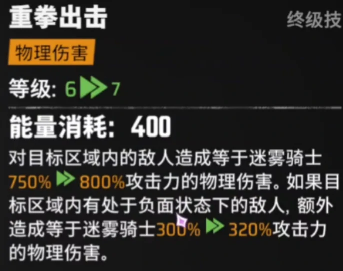 终极技能“重拳出击”:对区域敌人造成多段合计750%攻击力物理伤害。目标带负面状态,再砸320%攻击力额外伤害。技能自带高暴击率,能量满、敌人挂减益时释放,输出拉满。
