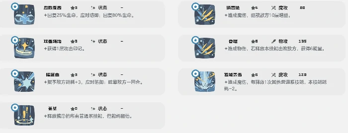 PVP对战表现出色,拥有多种干扰技能。摇篮曲:消耗对手,附加眩晕控制;聒噪:持续压制对方攻击能耗。搭配应激反应特性,战场难缠度提升。势能轰击:减少能耗,借助攻击场地快速叠印记,爆发打出可观普通技能伤害。