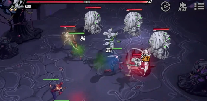 天赋依赖队友配合,回合制战斗建议手动操作,稳定触发效果。攻击技能蜘蛛集结:单体物理伤害附带溅射,邻近单位少量受伤;敌人分散时,搭配聚怪英雄使用,最大化输出。