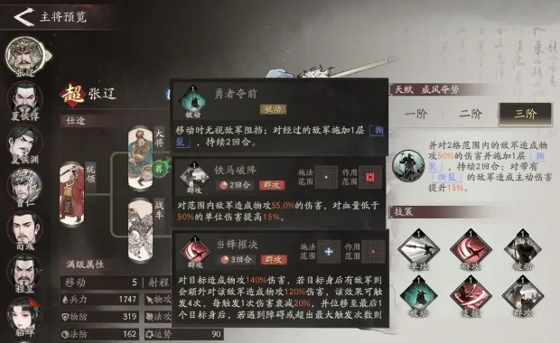 张辽:统帅定位,主动技能不触发敌方反击,克制反击型队伍。命中两目标以上为队友提供冲锋增益,骑兵队友额外追加攻击。适配骑兵阵容,显著提升整体输出与战术灵活性。