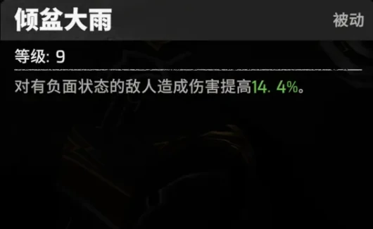 天赋倾盆大雨:敌人带负面状态触发额外伤害加成,依赖队友先手施加减益,推荐搭配燃烧状态角色如霹雳火。