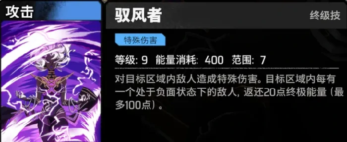大招御风者:区域特殊伤害,能量返还机制——每有1名负面状态敌人返还20点终极能量,最多返还100点。消耗400点能量,依托机制高频释放。