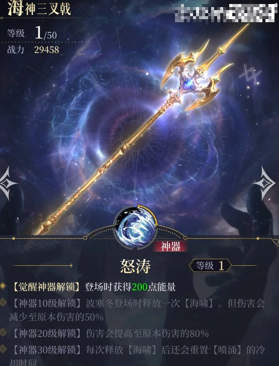 神器搭配推荐海王三叉戟,触发觉醒状态并提供怒涛效果:登场时回复200能量,加速终结技释放。神器10级登场直接发动50%原效果海啸伤害;20级海啸伤害提升至原效果80%;30级每次海啸减少喷涌技能冷却时间,实现高频伤害与连续击倒控制。