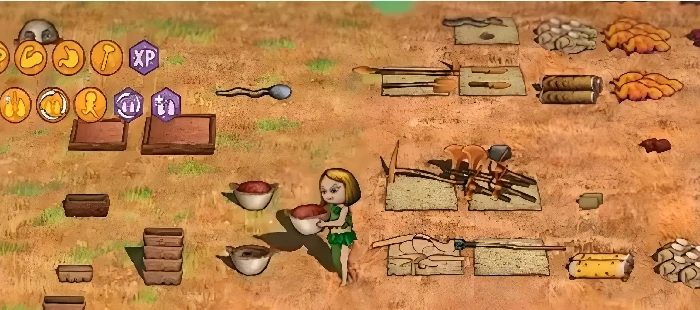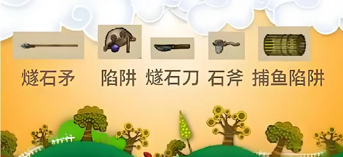 新手首选斧子、燧石矛、燧石刀、陷阱,快速制作,捕获兔子、野鸡等小型动物。后期解锁弓箭、投石索,远程攻击大型动物,保持安全距离,降低风险,提升成功率。