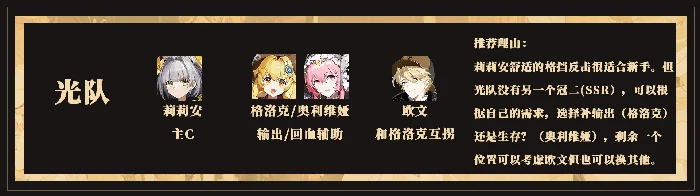 p>第二套:莉莉安为主要输出,搭配格洛克和欧文组成光系阵容。莉莉安格挡反击机制对新手友好,格洛克作为副输出弥补伤害缺口,欧文提供辅助支持,整体容错率较高。