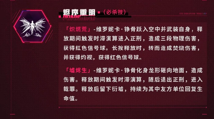 普通攻击分两种状态,均为物理伤害:裁罪状态,使用蓝球、黄球,普攻获取蓝球;正刑状态,获取红球、黄球,普攻获取红球。状态切换时,信号球颜色保留,避免混淆。释放必杀技“烬序重明”,进入武装状态,造成三段物理伤害并附加灼视效果。