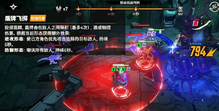 技能消耗低、施放无前摇,适合稳固前排队伍。战术技能盾牌飞掷投向敌人,击中后最多弹射4个目标,每次弹射造成物理伤害,伤害值受当前形态加成。