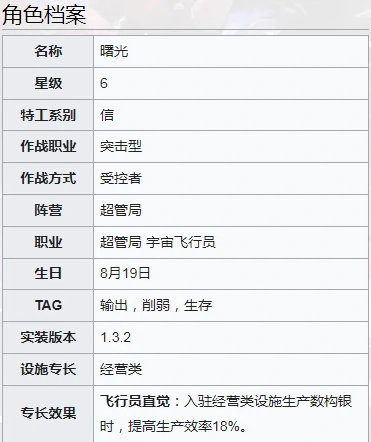 属性成长愈战愈勇,一级生命值573,满级4935,生存与输出兼备。突破二重门全属性提升5%,整体战力增强。基地运营天赋飞行员直觉,入驻提升18%生产效率,助力资源发展,探索和NPC互动有优势。