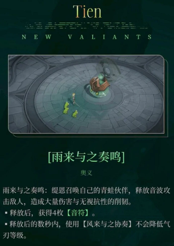 终结技风来与之协奏,按气刃等级选释放时机。奥义雨来与之奏鸣召唤青蛙助战,单用人一般,组合终结技提升生存、输出,提供前排掩护。技能间穿插普攻,维持连击数,伤害最大化。