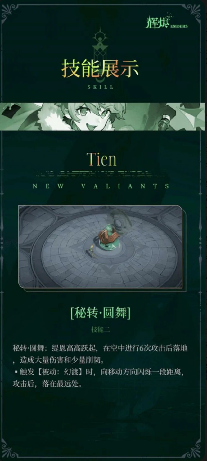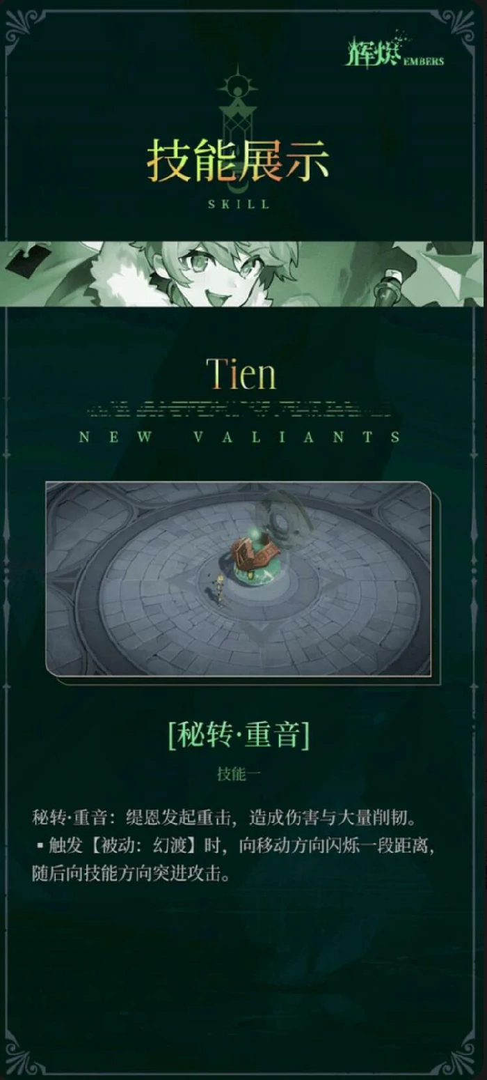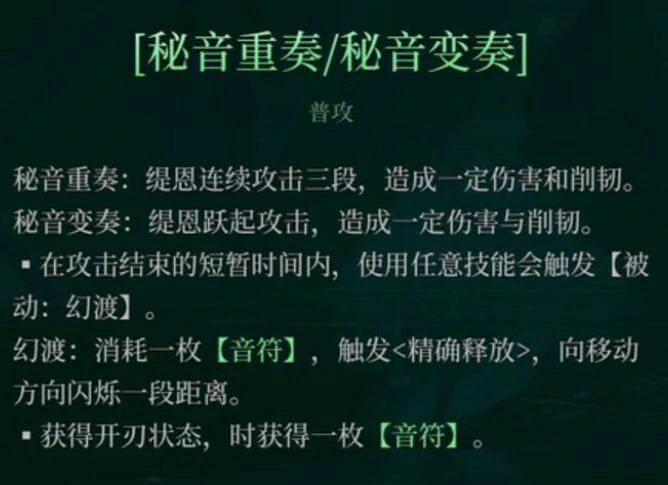 普攻分秘音重奏三连击、秘音变奏起跳攻击。普攻后快速接技能触发被动,类似瑞文手感。一技能秘转重音,高伤强削韧,幻渡状态带闪烁突进,可躲技能、追目标。