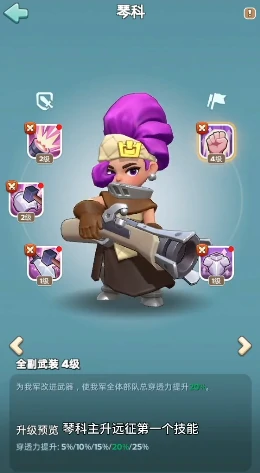 琴科是紫色品质辅助英雄,入手门槛低,技能加点思路清晰。优先升级第一个核心技能,升级后为全队提供资源增益,提升远程任务与资源采集效率。其余远征与讨伐类技能,前期暂不投入,核心技能满级、阵容基本成型后再逐步补足。