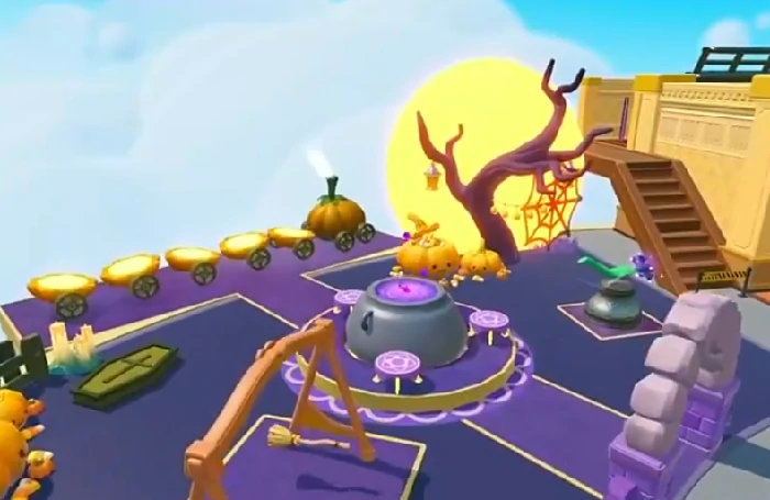 蛋仔岛更新万圣节区块:南瓜车队巡游,扫帚秋千悬浮。花朵坐骑飞行,连体南瓜车游览,魔药炼制触发奇幻特效。
