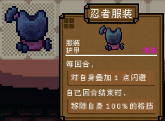 胸甲系列:每回合持续触发能力,常见青铜胸甲、束腰外衣、忍者服装。忍者服装(紫色品质):提高闪避速度,移除格挡效果,行动结束自动清除自身格挡状态,适合高机动性玩法,改善战局灵活性、操作手感、生存表现。