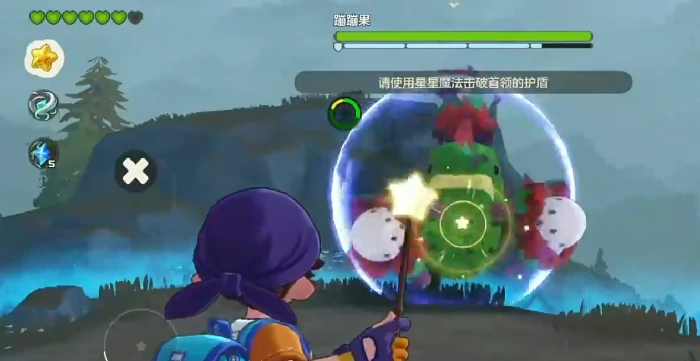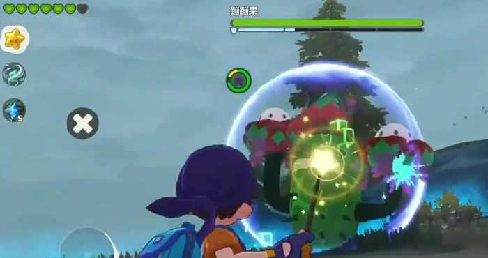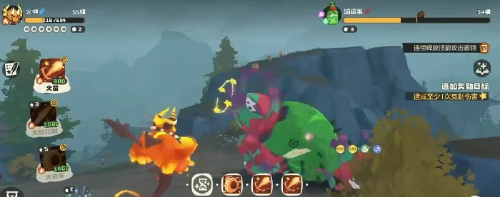 蹦蹦果,草+毒双系,带生物碱特性,施放技能附加两层中毒。战斗分两阶段:初始非精灵对战,首领主跳跃发动大范围地面攻击,前摇明显,见预兆及时闪避;跳跃时目标难锁定,别频繁用星星魔法输出;闭眼待机即回血,全力进攻打断,防止战局拖延。