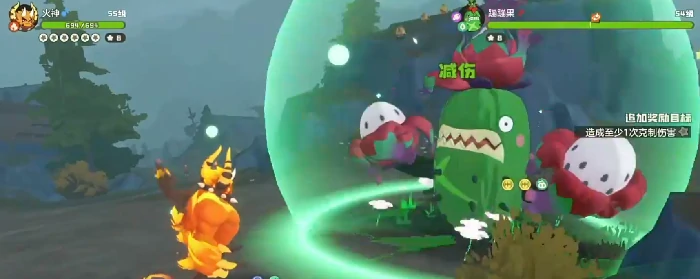 击破护盾,选三种增益。队伍缺物攻加成?优先提升生命,增强下一阶段生存力。进入精灵对战,草系蹦蹦果怕火系,火神等火系精灵靠属性克制高效输出。
