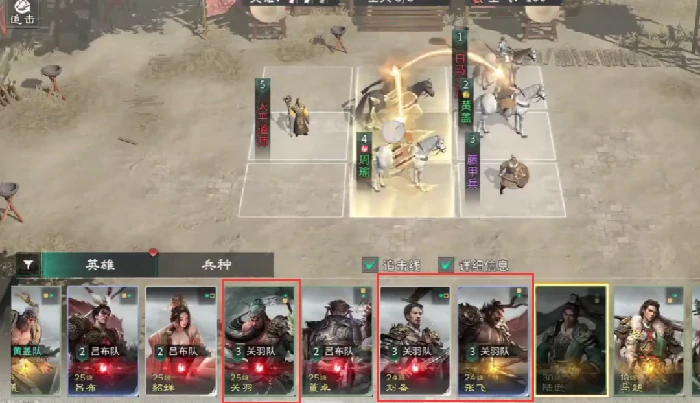 同时要让关羽处于刘备与张飞的追击范围内,充分发挥输出潜力。另一侧追击位可选白马义从或穿杨军,若无合适人选,用术士类武将暂代也行。