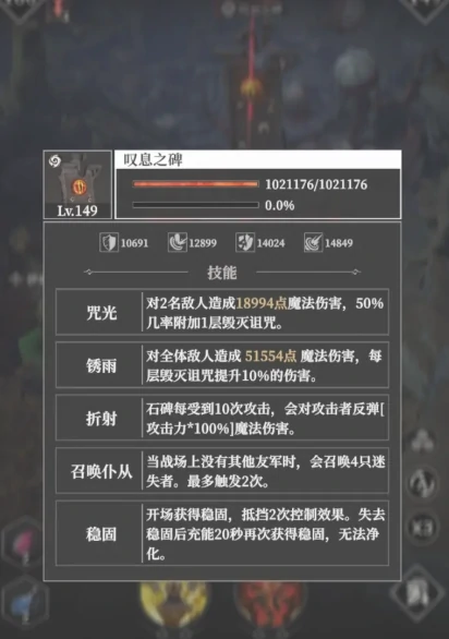 进入墓道,直面核心首领叹息之碑。石碑异变后释放竖瞳与触须,发动高伤近身攻击并持续召唤高攻小怪,忽视小怪将导致后排溃败。