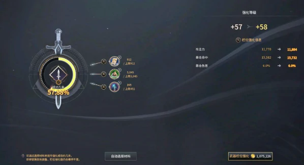 武器强化优先选最高强化率,如57级升至58级,攻击从11770增至11884,暴击率同步增长。选对材料,关注成功率,强化数值不会倒退。防具强化等成功率100%时进行,节省资源。