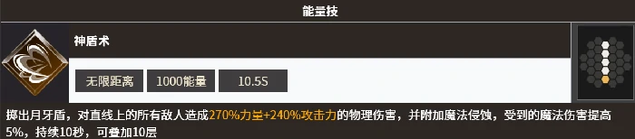 能量技能“神盾术”,直线投掷月牙盾,物理伤害为力量270%+攻击力240%,给路径敌人上“魔法侵蚀”,让其受魔法伤害提高5%,可叠加到10层。