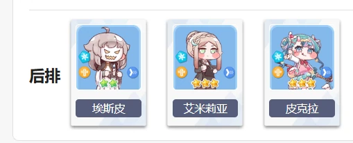 后排选择埃斯皮、艾米莉亚(辅助角色):埃斯皮治疗队友,对冰属性敌人增伤;二者协同维持队伍状态稳定,增强整体作战能力。该搭配核心优势:控制与持续伤害兼具,配合群体减速、净化技能,应对召唤类敌人和负面状态。