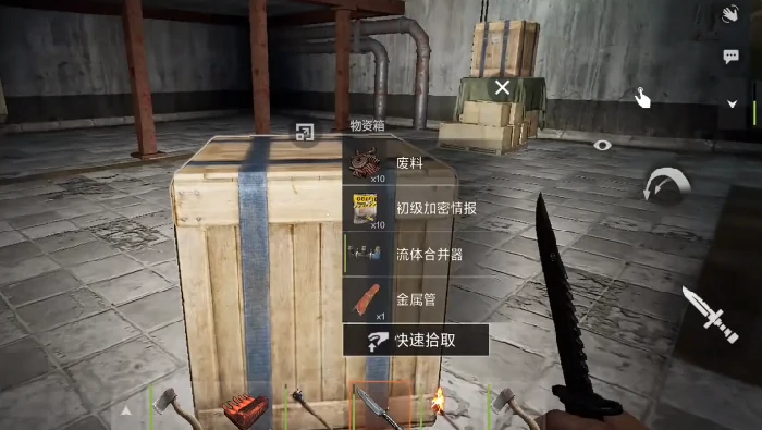 清敌完毕,在周边找多个物资箱和散落工具箱。开箱获金属管、初级加密情报、废料等资源,按需拾取有用物品。