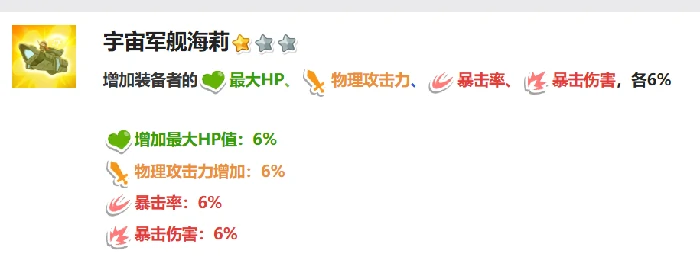 海莉机制灵活,适配多种阵容。搭宇宙军舰人格,推图、攻坚表现突出。队伍有更强输出时,调至辅助位,控场、团队增益。