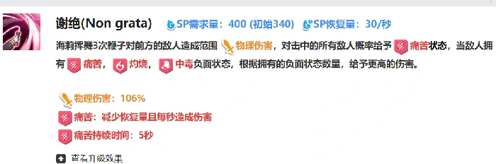海莉定位输出,站中排。物理输出,精灵系,搭同种族成员。技能带负面状态,干扰敌人。一技能谢绝:三连鞭击,范围物理伤害最高106%,概率施加痛苦(降治疗、持续伤5秒)。目标有痛苦/灼烧/中毒等负面状态,额外增伤。先让其他角色挂debuff,再用此技能,最大化输出。