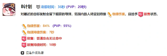 二技能B计划:冷却36秒(PVP20秒)。投烟雾弹,范围物理伤害84%(PVP55%),敌人致盲10秒(普攻不命中)。PVP伤害削弱,致盲对物理输出敌人有战略价值,用前考虑队伍需求、战场情况。