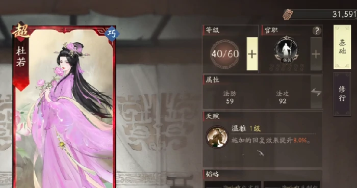 杜若定位副将,红卡品质,获取简单:玩家等级达30级系统直接赠送;未达等级可通过探访功能积累次数抽取,概率较高。前期实用度高,适配新手队伍,治疗与续航能力突出,弥补初期防御短板。