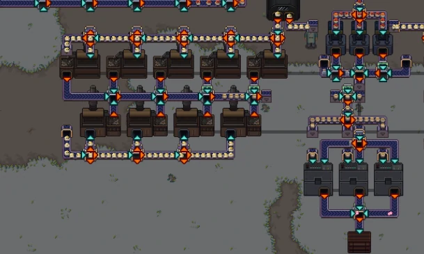 钢制品生产线独立规划,配4台熔炉+3台缓冲冲闸机,仓库压力大时增加缓冲设备。铁矿采集点贴近钢制品线,缩短运输时间,提升产出效率。