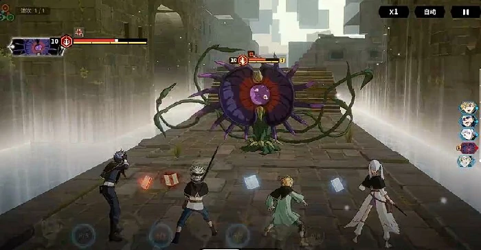 中期推进以主线副本为主,每日体力尽量推关卡。松果商店兑换初级技能书,玛格那二技能5级后推图效率大增。钻石每日买五次体力药(每次80体力),前期优先用于体力恢复,不抽卡。铜币升级角色前两层被动技能,特别是攻击类被动,性价比高。标准阵容:玛格那(1号位)、尤诺(2号位)、米莫萨(治疗,支线获取)、亚斯塔(系统送的防御角色)。战斗时,玛格那先手放“爆杀散弹魔球”施加烧伤,尤诺接“白枪”沉默BOSS,米莫萨治疗。BOSS血量到一半,保留玛格那大招打断关键技能,部分BOSS全屏大招靠大招硬抗。