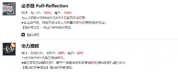 核心技能“反射光线”:单体95%魔攻伤害,50%概率追加30%伤害;可叠加魔力属性提升释放频率补伤害缺口。“多重反射”:3回合冷却,125%魔攻伤害,自身带增益状态额外增伤50%,强化后加22%暴击率。AOE“全反射”:150%魔攻伤害,暴击追加90%伤害。技能组依赖反射与追加伤害,需暴击和增益状态支撑输出,暴击不足战力明显下降。