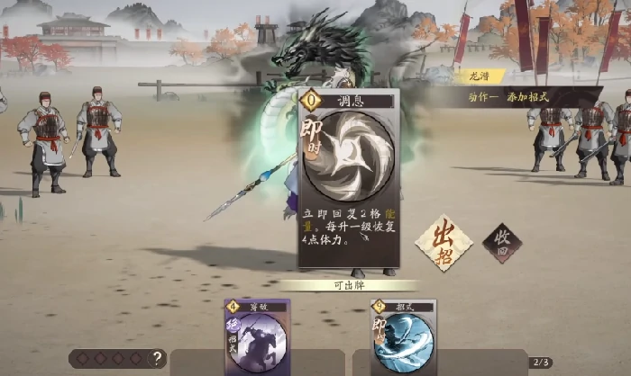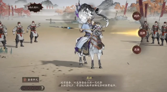 双方使用同类招式时,进一步区分进攻、防守、回气等类型,防守技反制进攻,进攻技压制回气,回气克制防守,形成环环相扣关系,被克制所受伤害大幅提高。武将姿态互相牵制,如贺举姿态偏向进攻,此时使用招架或爆气类技能效果良好。